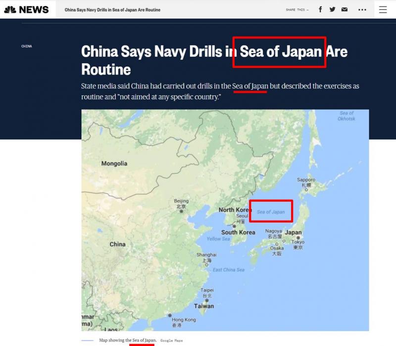 NBC news À¥»çÀÌÆ®¿¡ Ease Sea ´ë½Å Japan Sea¶ó´Â À̸§À¸·Î Ç¥±âµÇ¾î ÀÖ½À´Ï´Ù |